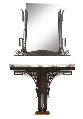 An Art Deco Iron Work and Marble Top Console Table with Mirror Height of console 32 x width 39 x 10 inches.