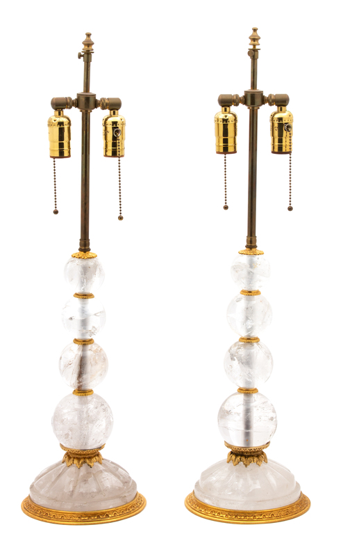A Pair of Gilt Bronze Mounted Rock Crystal Table Lamps Height 28 1/2 inches overall.