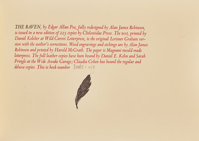 (Easthampton, Massachusetts): Cheloniidae Press, (1986). First and limited edition, Binder's Copy (from a total of 225). Oblong 8vo. Illustrated with a tipped-in etched frontispiece portrait of Poe and nine full-page wood-engravings by Alan James Robinson. With an additional suite of 10 of the wood-engraved plates, each signed by Robinson. Publisher's three-quarter red niger over black paper-covered boards, spine stamped in blind; fore-edge untrimmed; suite of plates loose as issued in paper folder and grey cloth chemise; together in matching grey cloth fall-down-back box. Signed prospectus laid in with suite of plates.