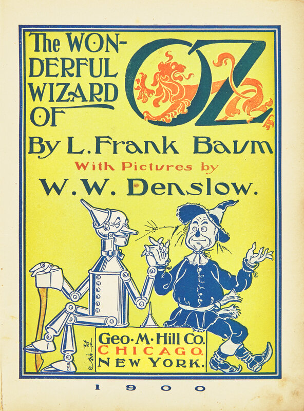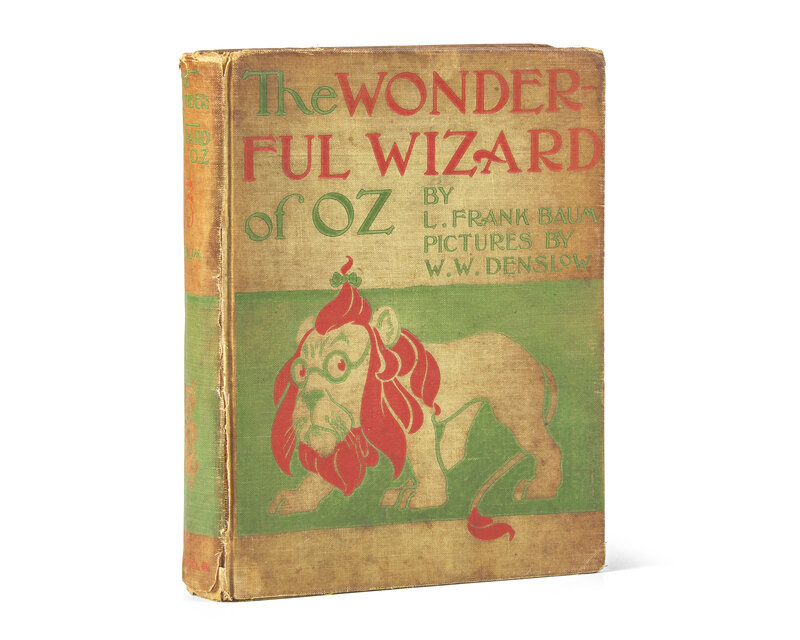 Chicago and New York: Geo. M. Hill Co., 1900. First edition, second state, binding variant C. 8vo. 259, (3) pp. Illustrated with tipped-in color title-page, 23 tipped-in color plates, and numerous in-text illustrations in various color shadings, by W.W. Denslow. Original third state green pictorial cloth, with publisher's imprint at foot of spine stamped in red in serifed type, boards stamped in green and in red, boards soiled, spine darkened, spine ends chipped and frayed; all edges trimmed; front hinge split exposing spine; prelims sprung; scattered soiling to text and plates; contemporary gift inscription on front blank; scattered edgewear. Hanff & Greene I.2