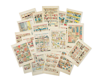 New York: The New York Herald Co., January 1907-December 1908. Comprising 42 original printer's proofs in color, on coated paper. Each measuring 25 1/8 x 18 in. (638 x 457 mm); one measuring 20 7/8 x 16 1/8 in. (530 x 409 mm). Date added in contemporary manuscript in top edge of all but one sheet. Edges brittle, with scattered small chipping and short closed tears, others scattered light to moderate wear and soiling. From the collection of Alfred B. Hunt, pioneering colorist at The New York Herald.