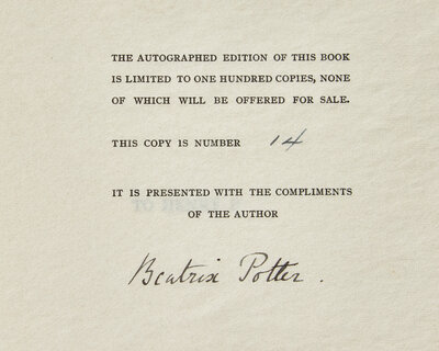 Rare first and limited edition, one of only 100 copies printed and not intended for sale, and published to reserve copyright; issued simultaneously with the first trade edition. Potter did not wish to publish this work in England, as she felt the work was "too personal – too autobiographical" (Linder), but due to reciprocal copyright arrangements between the U.S. and Great Britain, publication in one country resulted in the relinquishment of copyright in the other. In order to avoid this, Potter had McKay, the Philadelphia publisher, give her 100 sets of sheets from this edition, and had a local publisher alter the first gathering.