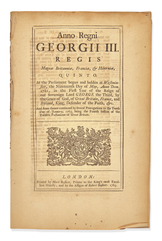 "This is the original folio edition of the famous (or infamous) Stamp Act, by which the American colonies were taxed in and on their business papers" (Church). "The importance of this act to our history needs no comment" (Streeter). Sabin and Howes note an octavo edition of sixty-six pages, also printed by Baskett in London in 1765. This momentous law was reprinted several times in the American colonies in 1765, in editions in Boston, New York, Philadelphia, Annapolis, New London, and Woodbridge, New Jersey.