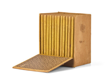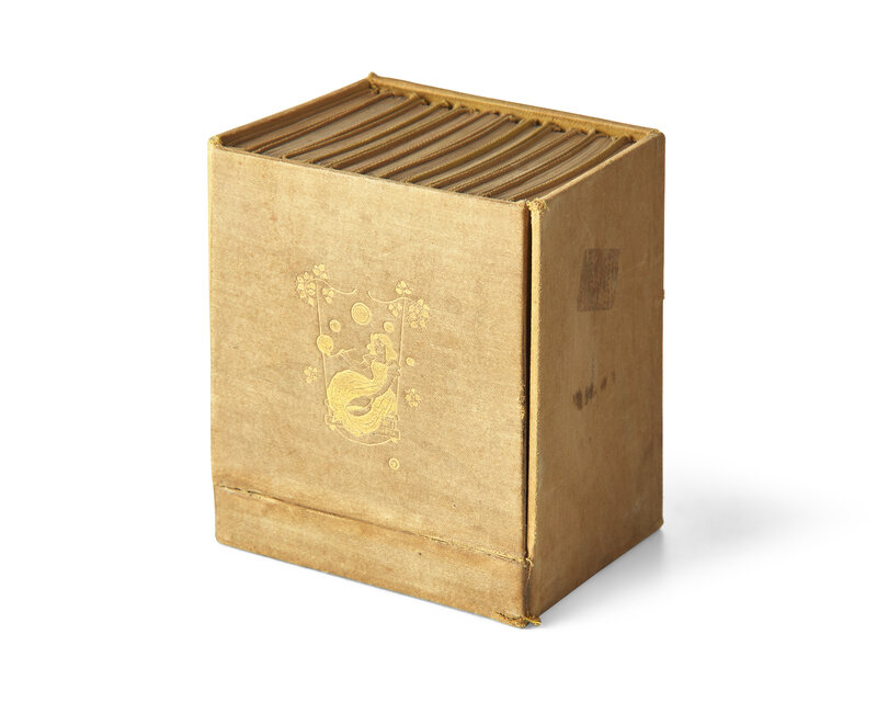 London: J.M. Dent & Co., 1894-95. In 12 volumes. 16mo. With numerous illustrations, by Sidney H. Heath, Charles Robinson, Alice B. Woodward, R. Anning Bell, H. Granville Fell, Alice M. Mitchell, R. Heighway, Violet M. and Evelyn Holden, and H. Isabel Adams. Publisher's green cloth-covered boards, decorated in gilt, purple silk ties, boards uniformly warped, lightly and unevenly faded; top edges gilt, other edges untrimmed; illustrated endpapers by Bell; scattered light toning and spotting; in rare original cloth box, decorated in gilt, with hinged panel, top wanting.