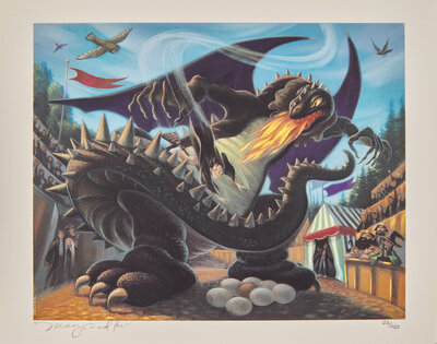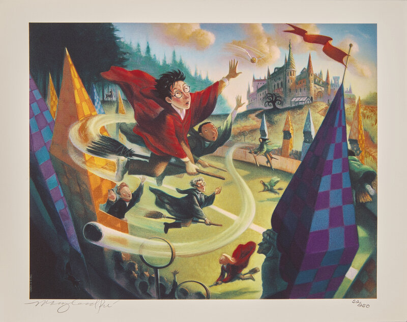 Suite of seven Harry Potter prints, each signed by illustrator Mary GrandPre. Includes: "Quidditch"; "The Rescue of Sirius"; "Battle with The Dragon"; "The Three Broomsticks"; "Christmas in the Great Hall"; "The Enchanted Car"; and "The Flying Keys".
