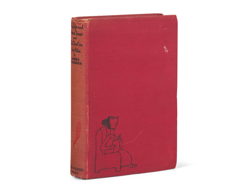 London: Blue Ribbon Books, (ca. 1937). 8vo. xviii, (ii), 153, (1), xvi, 151 pp. Presentation copy, inscribed by Thurber on front free endpaper to his London gallery director Eardley Knollys ("drawn for Eardley Knollys / Sept 22, 1937, as ever James Thurber"), and with an original full-page drawing by Thurber of a sleeping dog and two people on same. Publisher's red cloth, stamped in black, spine faded, scattered soiling; without dust-jacket. From the library of William S. Reese.