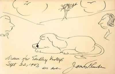 Presentation copy, inscribed by Thurber and with two original drawings by him, for Eardley Knollys. Knollys, along with Frank Coombs, operated the prestigious Storran Gallery in London, from 1936-39. Thurber had a one-man show of his drawings at Storran, in 1937-38.