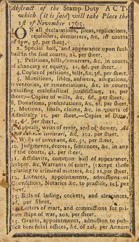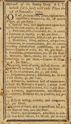 The Stamp Act of 1765 was the first British Parliamentary attempt to impose a direct tax on the American colonies. It called for all legal documents, permits, pamphlets, newspapers and other publications to carry a tax stamp. Although the amount of the tax was relatively small, the Act raised the ire of the colonists who united in its opposition and raised the cry of "No taxation without representation." Intimidation and violence against the tax collectors made enforcement nearly impossible and the Act was repealed in March 1766. "The passage of the Stamp Act transformed American opposition to British policies...It was of enormous importance in that it produced at least a surface unity among the colonies, for almost every political leader, whatever his political principles, was opposed" (Jensen, The Founding of a Nation).