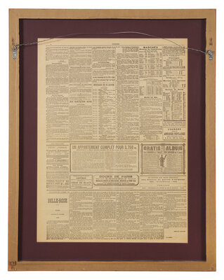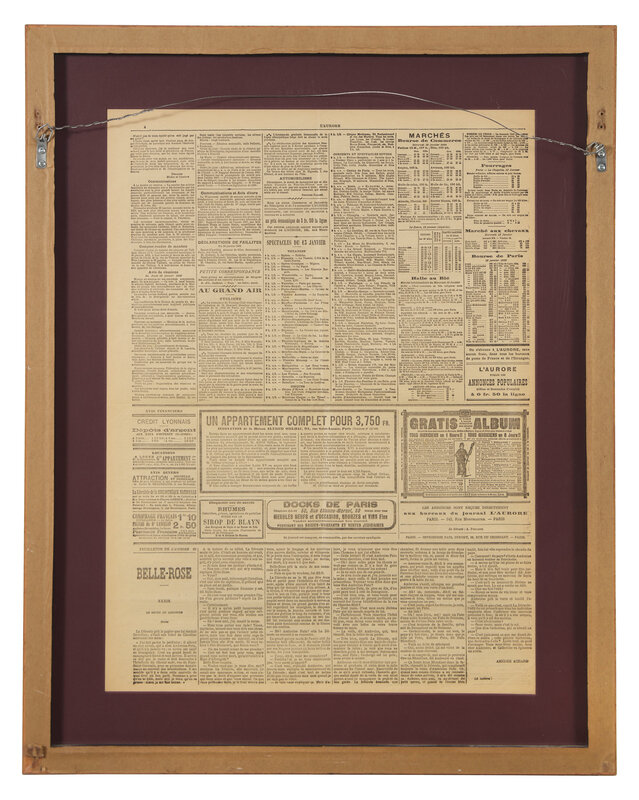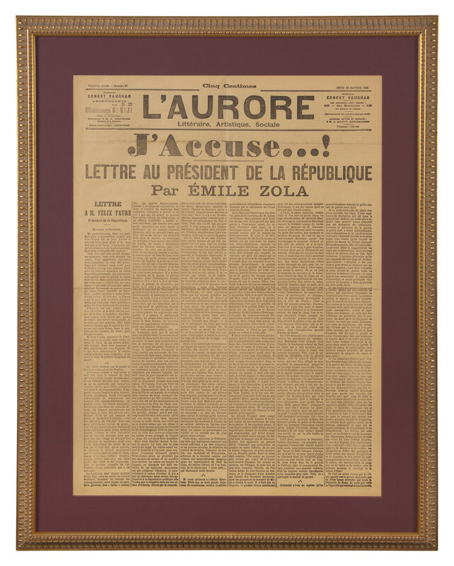 (Paris: Ernest Vaughan), January 13, 1898. Bifolium, 23 1/2 x 17 in. (597 x 432mm) (sight). Printed newspaper. Creasing from old folds; scattered light soiling. In mat and in double-pane gilt frame, 30 x 23 1/2 in. (762 x 597 mm).