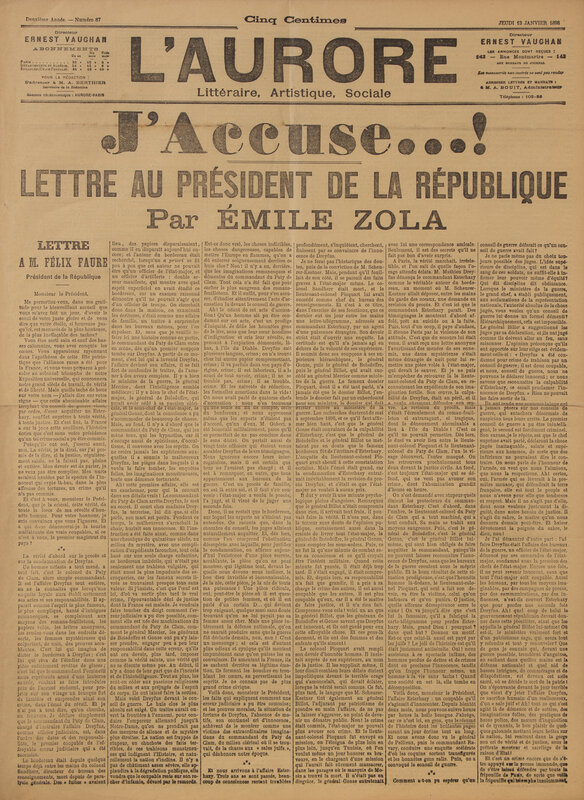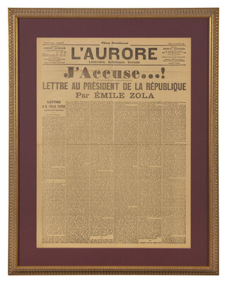 Very well-preserved issue of the L'Aurore newspaper featuring Emile Zola's famous open letter J'Accuse...!, calling for action in the ongoing Dreyfus Affair.