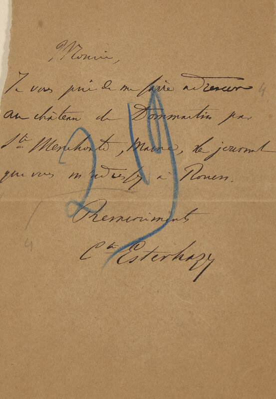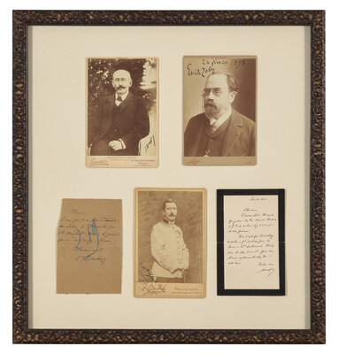 Paris, ca. 1898 and after. Comprising five items, signed or inscribed by the major figures of the Dreyfus Affair: Alfred Dreyfus, Emile Zola, Georges Picquart, Ferdinand Walsin Esterhazy, and Hubert Joseph Henry. Includes three cabinet cards: Emile Zola, published by P. Nadar ("24 fevrier 1898 Emile Zola"); Alfred Dreyfus, published by Gerschel ("A. Dreyfus"); Georges Picquart, published by A. Gerschel ("a Mll. Ginette Risler 28 Janvier 1900 G. Picquart"). Two autograph letters, signed: Ferdinand Walsin Esterhazy, no place, no date ("Sir, I requested you to provide to me at the castle of Dommartin near Saint Mennehould, Marne, the journal that you had read to me in Rouen. With thanks Commandant Estherazy"); Hubert Joseph Henry ("Thursday night My dear friend, I had told Reinhart (sp?) that I would be at his house on Friday at 9:30 in the morning and I had kindly asked him to let you know. He is writing to me that he is forced to leave the house at 9:00 in the morning and is asking me to come at 11:00 instead would you be so kind to also find me at his place at this time. Kindly yours Henry"). Together in double-pane glass frame, 19 1/2 x 18 1/4 in. (495 x 463 mm).