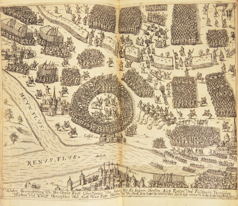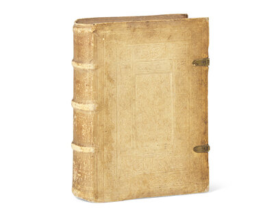 Cologne: Gottfried von Kempen, 1590-91. Six works in one volume. 4to. (viii), 187; (viii), 171, (1); (viii), 129, (1); (viii), 119; 87, (1); (viii), 64 pp. (erratic pagination throughout). Illustrated with four folding engraved plates depicting battlefield scenes. Full contemporary pigskin over boards, elaborately decorated in blind, original clasps and straps intact, title in manuscript on upper spine; edges stained red; old abrasion at center and in top corner of title-page; text leaves moderately toned; scattered spotting to text; scattered wear along edges; contemporary marginalia O1v and O2r.