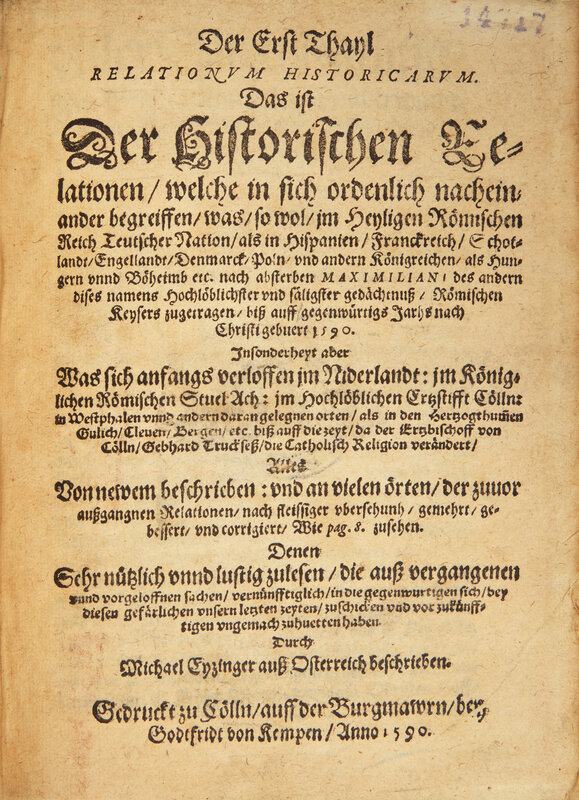 [Early Printing] Eytzinger, Michael. Der Erst Thayl Relationum Historicarum. Das ist ist Der Historischen Relationen, welche in sich ordenlich nacheinander begreiffen, was, so wol, jm Heyligen Römischen Reich Teutscher Nation, als in Hispanien...