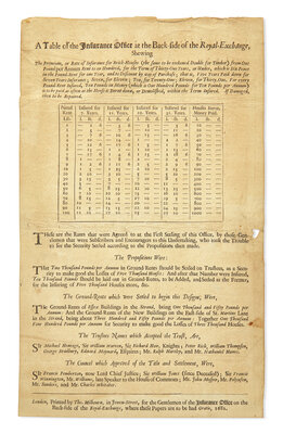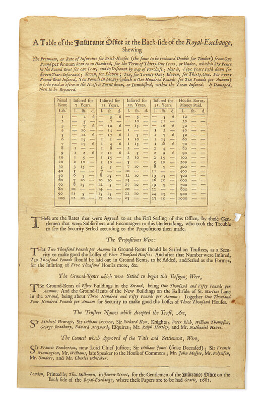 London: Printed by Tho. Milbourn...for the Gentlemen of the Insurance Office on the Back-side of the Royal-Exchange, 1682. Printed folio sheet, 13 1/8 x 8 1/8 in. (333 x 206 mm). Initialed on verso, "A.M." Crease from old fold, small small in right edge, now repaired with tape; scattered light spotting. See Nicholas Barbon--Founder of Modern Fire Insurance (The Review of Insurance Studies, Vol. 1, No. 2, Jun., 1954, pp. 44-47); Wing T-81