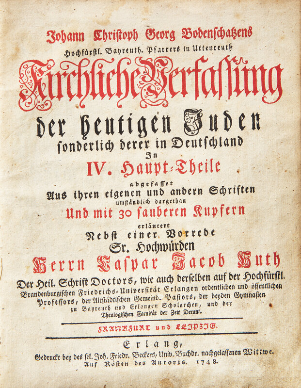First edition of German theologian Johann Christian Bodenschatz's important work on 18th-century German Jewish life and customs. Born in Hof, Bavaria, Bodenschatz was an eminent German protestant theologian who received his early education in Gera where he became interested in biblical and oriental subjects. He later studied oriental languages at the University of Jena.