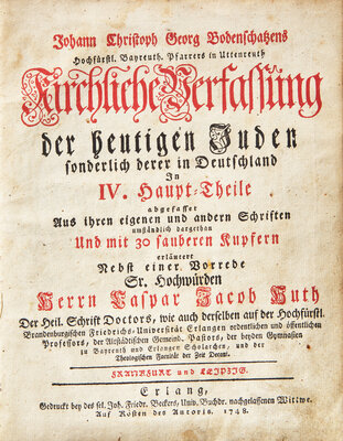 [Judaica] Bodenschatz, Johann Christoph Georg. Kirchliche Verfassung der heutigen Juden sonderlich derer in Deutschland...