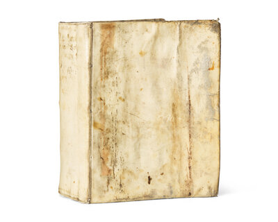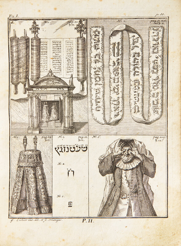 Frankfurt, Leipzig, and Erlangen, etc.: Joh. Friedr. Becker and Georg Otto, Auf kusten des Autoris, 1748-(49). Two volumes in one, comprising four total parts. First edition. Thick 4to. (xiv), 206, (2), 328, 331-386 (i.e. 384); (16), 256; 270, (34) pp. Two general title-pages, printed in red and in black. Text in German and in Hebrew. Illustrated with an engraved frontispiece and 29 engraved plates. Full contemporary vellum, contemporary manuscript title on spine, soiling to boards; edges stained red; light to moderate soiling and spotting to prelims and text; dampstaining in upper gutter of frontispiece and title-page; scattered small closed tears along edges; scattered contemporary marginalia. Fürst I, p. 124