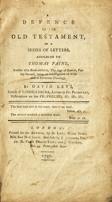 Scarce first English edition of Anglo-Jewish scholar David Levi's (1742-1801) refutation of Thomas Paine's The Age of Reason. Levi was the first English Jew to write in defense of Judaism, here against Paine's rationalist critique of the Hebrew Bible.