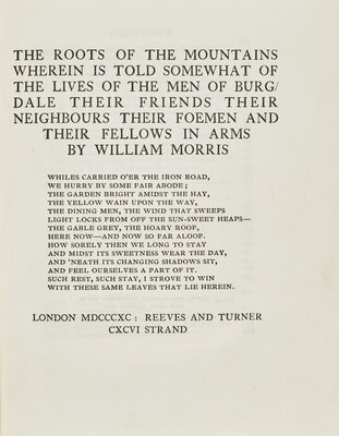 [Kelmscott Press] Morris, William. The Roots of the Mountains Wherein is Told Somewhat of the Lives of the Men of Burgdale Their Friends Their Neighbours Their Foeman and Their Fellows in Arms