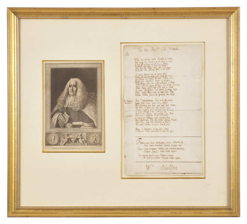 (Charterhouse School: Surrey, England, ca. 1735). Autograph manuscript poem, signed by William Blackstone, addressed "To the Rev:d Mr. Hotchkis". Single sheet, 14 7/8 x 9 in. (378 x 229 mm). Comprising 36 lines. In mat with engraved portrait of Blackstone, and in frame, 23 3/4 x 26 1/4 in. (603 x 667 mm). Published in Wilfred Prest, William Blackstone: Law and Letters in the Eighteenth Century, 2008, p. 24 and Appendix I (pp. 313-314)