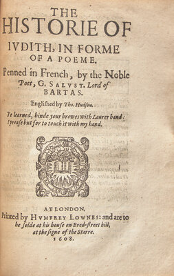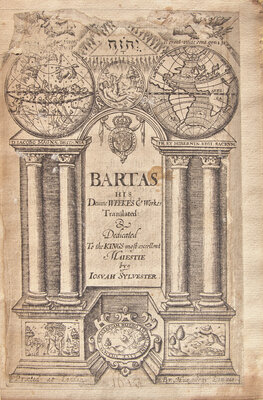 Guillaume de Salluste du Bartas (1544-1590) was a Gascon Huguenot courtier and poet who served in the court of Henri of Navarre. This work, his most well known, is an epic poem on the creation of the world, written in 1578, and first translated into English by Josiah Sylvester in 1605. While his influence in France waned after his death, he had a more profound impact in Protestant England, influencing the likes of Sir Philip Sidney, Edmund Spenser, and John Milton.