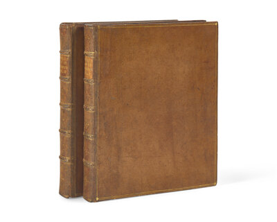 London: Printed by Henry Baldwin, for Charles Dilly, 1791. In two volumes. First edition, second issue (with corrected text on p. 135, line 10, reading "give"). 4to. xii, (xvi), 516; (ii), 588 pp. Illustrated with a stipple-engraved frontispiece portrait of Johnson, after Sir Joshua Reynolds, in first volume, and two engraved plates of facsimiles by H. Shepard, in second volume. Full contemporary speckled tan calf, morocco spine labels, stamped in gilt, rebacked; all edges trimmed; armorial book-plate of Henry Peirse of Bedall, in Yorkshire, on front paste-down of each volume; ownership signature of Rupert George on title-page of second volume; light scattered spotting to text; in slip case. Pottle 79; Courtney & Nichol Smith, pp. 172-3; Grolier, 100 English, 65