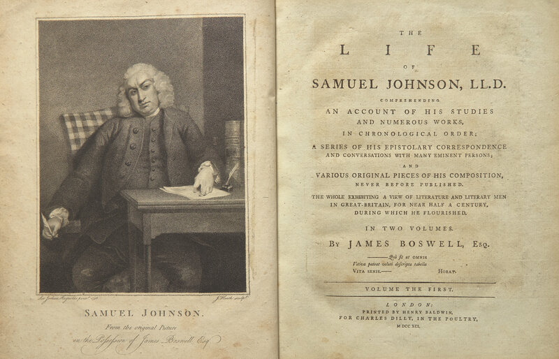 A fine first edition of Boswell's landmark biography of Samuel Johnson, one of the great achievements of English letters. "So successful was it that by August twenty-second, 1200 out of the edition of 1700 copies were disposed of, and the whole edition was exhausted before the end of the year..." (Grolier, p. 151).
