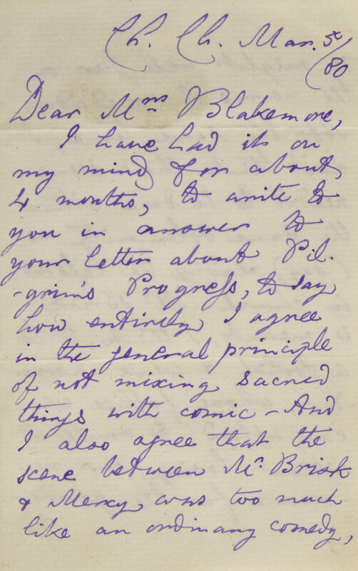 Christ Church, Oxford, March 5, 1880. One sheet folded to make four pages, 5 3/8 x 3 1/2 in. (136 x 89 mm). Four-page autograph letter, signed by Carroll in his characteristic purple ink, to Mrs. Sarah Elizabeth Blakemore, mother of Carroll's child-friend Edith Rose "Dolly" Blakemore: "I have had it on my mind for about 4 months, to write to you in answer to your letter about Pilgrim's Progress, to say how entirely I agree in the general principle of not mixing sacred things with comic..." Carroll continues by providing a review of the production and his thoughts on theater. Tipped into red cloth-covered boards (8vo), spine lettered in gilt; original postal envelope, signed by Carroll in purple ink, mounted on front blank, gift inscription, dated 1969, below same envelope.