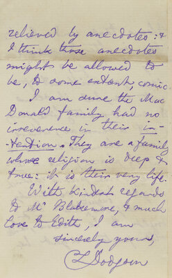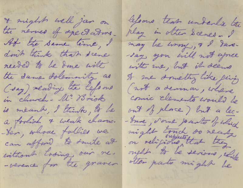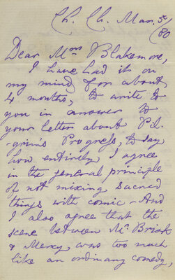 Autograph letter from Lewis Carroll to Sarah Elizabeth Blakemore, the mother of Edith Rose "Dolly” Blakemore (1872-1947)--one of Carroll's child-friends whose relationship lasted into adulthood--regarding his thoughts on theater.
