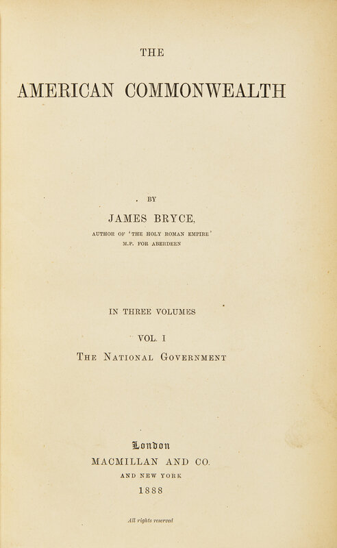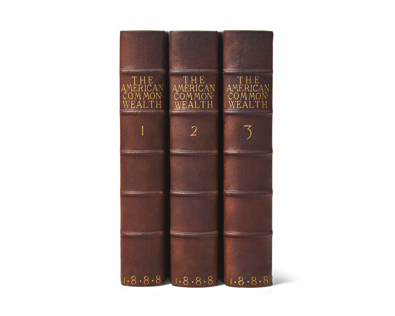 London and New York: Macmillan and Co., 1888. In three volumes. First edition. 8vo. Quarter blue morocco over light blue paper-covered boards, stamped in gilt, spines browned, boards unevenly browned, scattered soiling; all edges gilt; by The Doves Bindery. From the libraries of Americana collectors and bibliophiles, Amor L. and Valentine Hollingsworth, and with their gilt morocco book-plates on front paste-down of each volume.