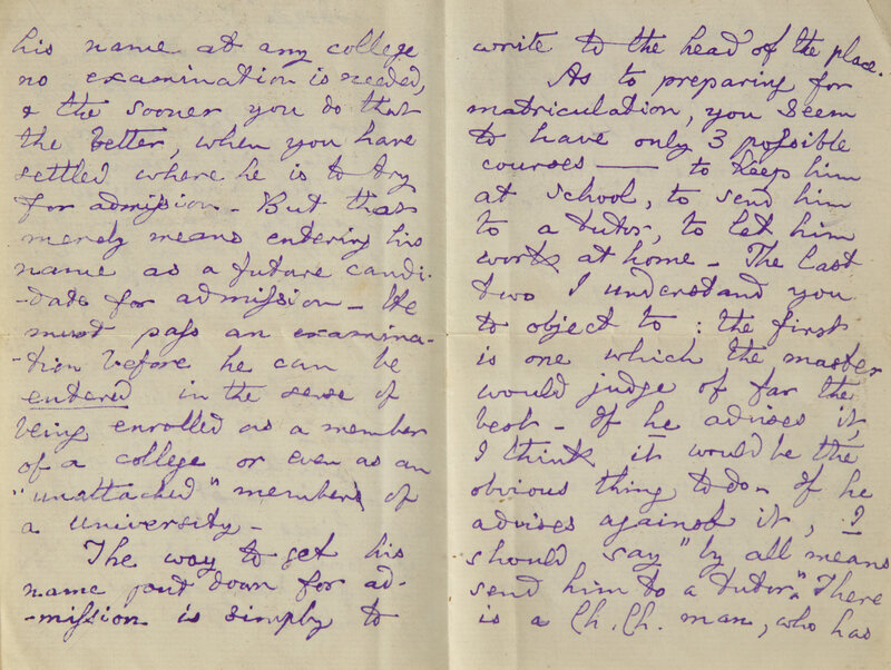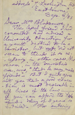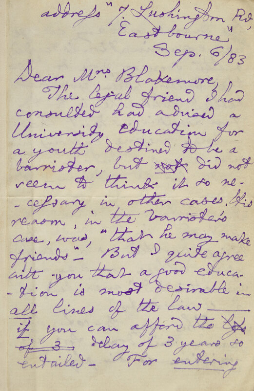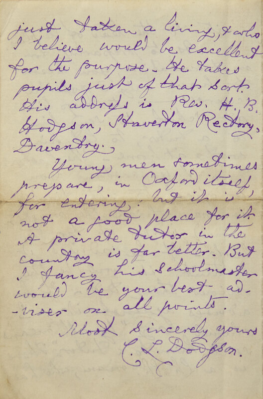 Eastbourne, September 6, 1883. One sheet folded to make four pages, 6 x 4 in. (152 x 102 mm). Four-page autograph letter, signed by Carroll in his characteristic purple ink, to Mrs. Sarah Elizabeth Blakemore, giving advice, presumably for one of her children, on entering university: "...I quite agree with you that a good education is most desirable in all lines of the law...The way to get his name put down for admission is simply to write to the head of the place. As to preparing for matriculation, you seem to have only 3 possible courses--to keep him at school, to send him to a tutor, to let him work at home...Young men sometimes prepare, in Oxford itself, for entering...", etc. Tipped into red cloth-covered boards (8vo), lettered in gilt along spine; gift inscription on front blank, dated 1969.