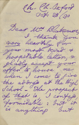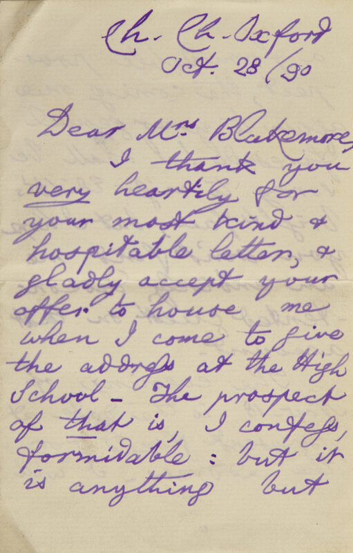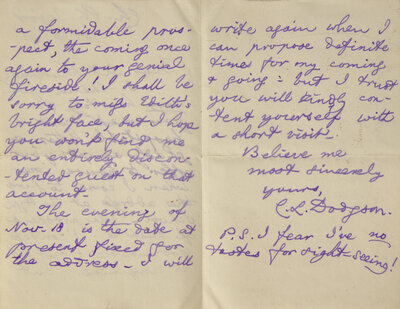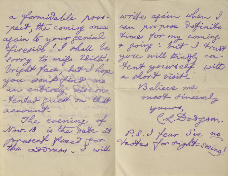 Autograph letter from Lewis Carroll to Sarah Elizabeth Blakemore, the mother of Edith Rose "Dolly” Blakemore (1872-1947)--one of Carroll's child-friends whose relationship lasted into adulthood--regarding his staying with the family.
