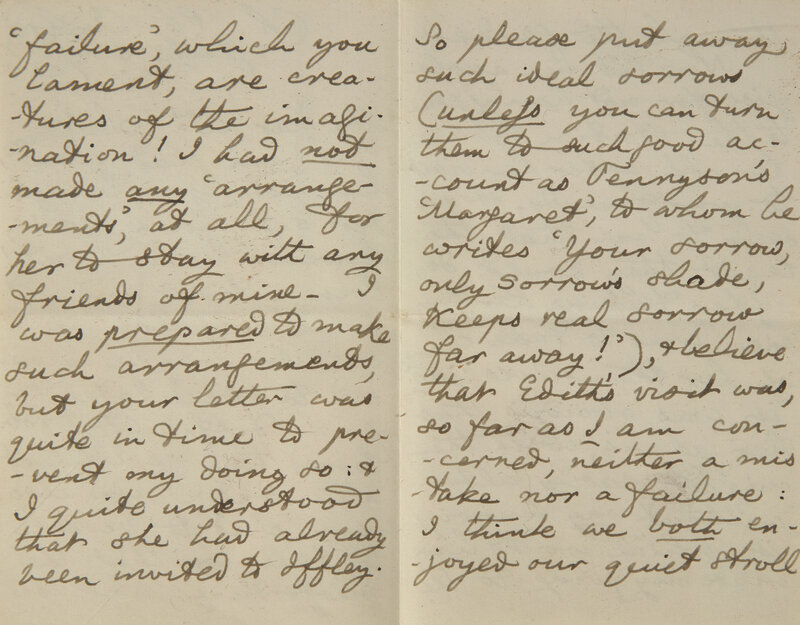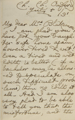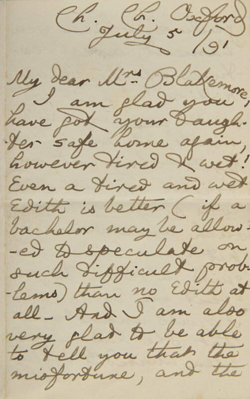Lengthy autograph letter from Lewis Carroll to Sarah Elizabeth Blakemore, the mother of Edith Rose "Dolly” Blakemore (1872-1947)--one of Carroll's child-friends whose relationship lasted into adulthood. Here Carroll defends his behavior during a recent visit by Edith.