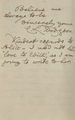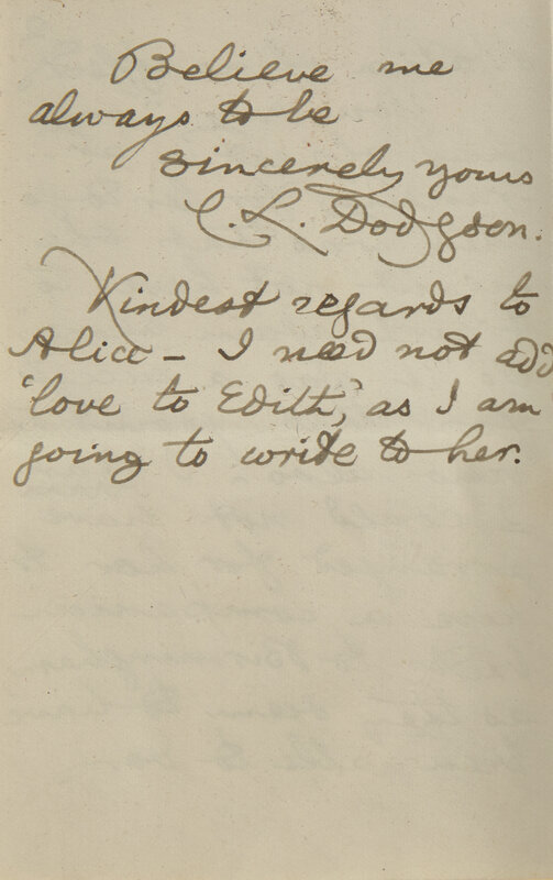 Christ Church, Oxford, July 5, 1891. Two sheets folded to make eight pages, each 5 1/2 x 3 1/2 in. (140 x 89 mm). Six-page autograph letter, signed by Carroll in grey ink, to Mrs. Sarah Elizabeth Blakemore, mother of his child-friend Edith Rose "Dolly" Blakemore, explaining his behavior in regards to a recent visit by Edith: "I am glad you have got your daughter safe home again, however tired & wet! Even a tired and wet Edith is better (if a bachelor may be allowed to speculate on such difficult problems) than no Edith at all. And I am also very glad to be able to tell you that the misfortune, and the 'failure', which you lament, are creatures of the imagination!...So please put away such ideal sorrows (unless you can turn them to such good account as Tennyson's 'Margaret', to whom he writes 'Your sorrow, only sorrow's shade, keeps real sorrow far away!'), & believe that Edith's visit was, so far as I am concerned, neither a mistake nor a failure..." Tipped into red cloth-covered boards (8vo), lettered in gilt along spine; gift inscription on front blank, dated 1969.