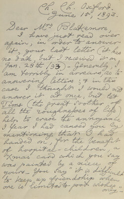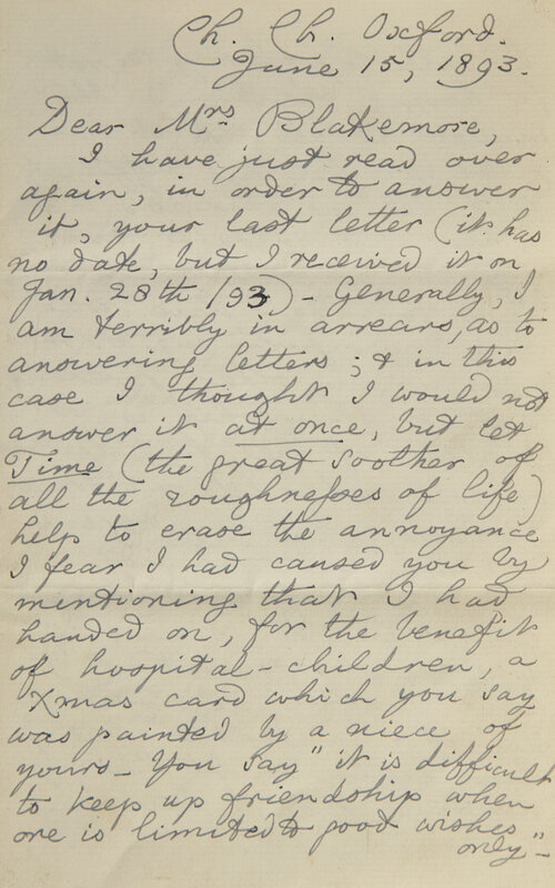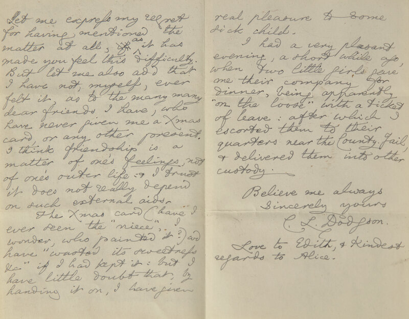Autograph letter from Lewis Carroll to Sarah Elizabeth Blakemore, mother of Edith Rose "Dolly” Blakemore (1872-1947)--one of Carroll's child-friends whose relationship lasted into adulthood. Here Carroll attempts to smooth over a disturbance in their friendship after Carroll regifted a Christmas card from the Blakemore's, donated for the benefit of hospitalized children.
