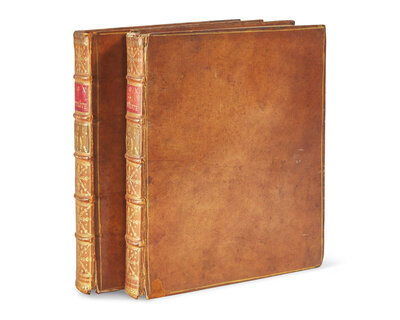 London: Printed for A. Millar, T. Osborn, T. and T. Longman, et al., 1755. In two volumes. First edition of Tobias Smollett's English translation. 4to. (iv), xxviii, 403; viii, 466, 1 (errata) pp. Translated from the original Spanish by Smollett. Illustrated with engraved frontispiece in first volume, and 27 engraved plates by G. Scotin after F(rancis). Hayman. Full contemporary speckled tan calf, red and green morocco spine labels, decorated in gilt, light wear to boards, chipping to spine ends of each volume; red speckled edges; armorial book-plate of Thomas Wharton on front paste-down of each volume; light offsetting from plates; scattered minor spotting to text; Xx1-4 bound out of order, following Tt4. ESTC T59887