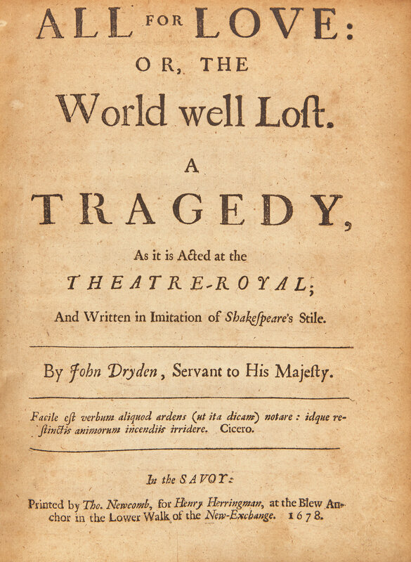 [Literature] Dryden, John. All for Love: or, the World well Lost. A Tragedy, As it is Acted at the Theatre-Royal; And Written in Imitation of Shakespeare's Stile