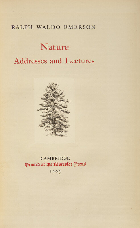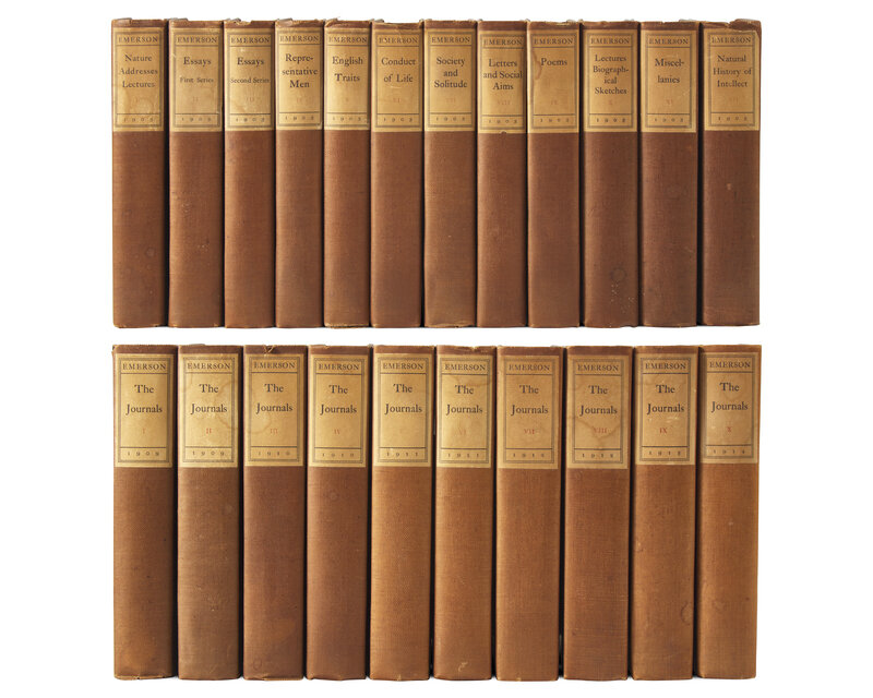 Cambridge: Printed at the Riverside Press, 1903-04. In 22 volumes (with the 10-volume Journals of Ralph Waldo Emerson). Autograph Centenary Edition, #361/600 numbered sets, signed by the publisher, including an autograph manuscript leaf of Emerson's bound in at front of first volume. Publisher's brown cloth, printed paper spine labels, some boards lightly soiled, cloth on front joint of first volume split, wear to some headcaps; all edges untrimmed; dampstaining to prelims of first volume, scattered foxing to same. BAL 5463; Myerson A44.3a