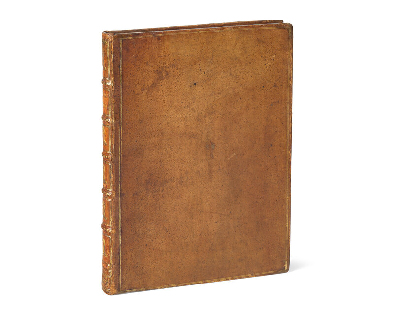 Rome: (Paolo Manuzio for) Vincenzo Luchino, 1564. First edition, second issue. 4to. (iv), 100 ff. Title-page within engraved architectural border, and with 100 engraved plates (each numbered in plate), as well as woodcut initials. Full speckled tan calf, stamped in gilt; red speckled edges; marbled endpapers; title-page trimmed close along top edge, affecting some of the border; spotting to text and plates; small loss in fore-edge of ff. 47, but not affecting text. Brunet II, 1160; Adams F-115; Harvard/Mortimer, Italian I, 178