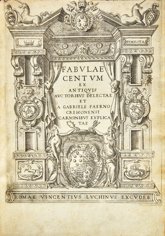 Scarce first edition, second issue (the first issue appeared in 1563) of Gabriele Faerno's collected fables, with 100 fantastic engraved illustrations after drawings ascribed to Titian and Pirro Ligorio. One of the finest illustrated works published in Italy in the 16th century, and one of the first to seriously utilize the etching process. This collection proved to be incredibly popular, reaching over 50 editions and translations, and inspiring the likes of La Fontaine and Perrault.