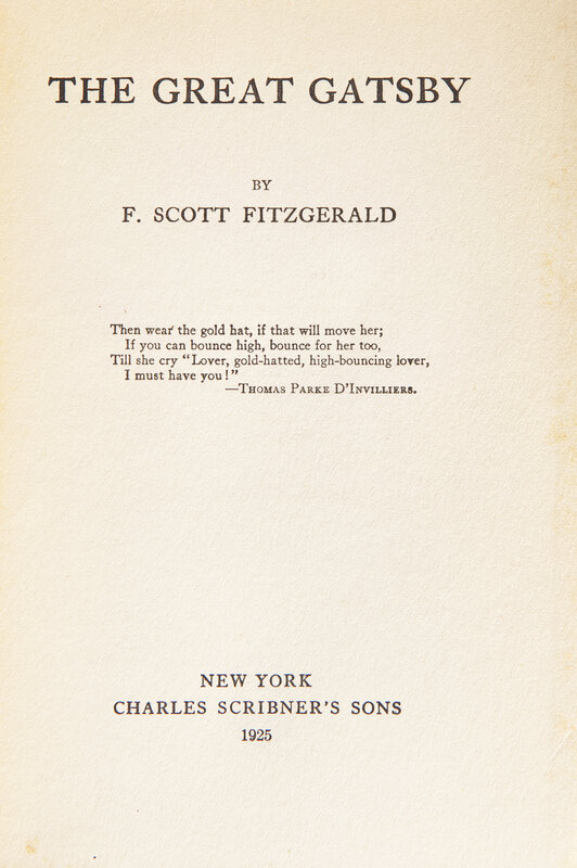 New York: Charles Scribner's Sons, 1925. First edition, first printing. 8vo. (vi), 218 pp. Publisher's dark blue-green cloth, stamped in blind and in gilt, faint stain on rear board, very slightly cocked; foxing to top and fore edge; contemporary ownership signature to front blank. Bruccoli A11.1.a
