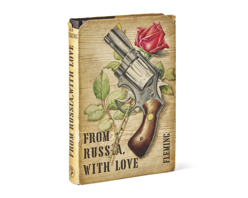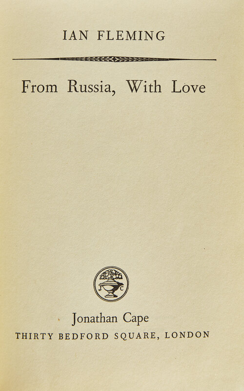 London: Jonathan Cape, (1957). First edition, first impression. 8vo. 253 pp. Publisher's black cloth, stamped with a revolver and rose design on front board in silver and metallic-red, spine lettered in same, light soiling to front board; in original pictorial dust-jacket, designed by Richard Chopping, losses along top edges at spine and flap folds, light wear along bottom panel edges, panel folds moderately worn; small circular yellow sticker at bottom of rear panel (applied by Lawrence Hughes, denoting importance). From the library of Lawrence Hughes, Fleming's friend and President of William Morrow and Company. Gilbert A5a (1.1)