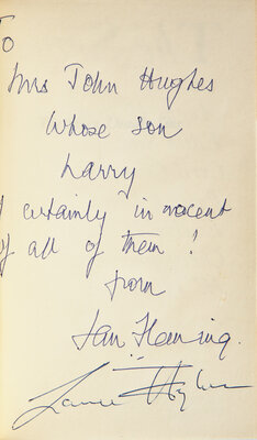 A fine presentation copy, inscribed by Fleming to Margaret Hughes, the mother of the book's publisher, Larry Hughes. Writing in the Foreword, Fleming notes his appreciation to Hughes for making the book's publication possible: "My next claim to introduce these essays was my suggestion to Mr Lawrence Hughes, a friend of mine and a Director of William Morrow & Co., that he should publish them in a book. Usually when one makes brilliant suggestions to a publisher, a dull glaze comes over his eyes and nothing happens. But in this case Larry Hughes was enthusiastic and, despite all kinds of copyright problems, energetically pursued my suggestion and gathered these seven famous English authors together between hard covers--no mean feat if you know anything about copyright and literary agents."