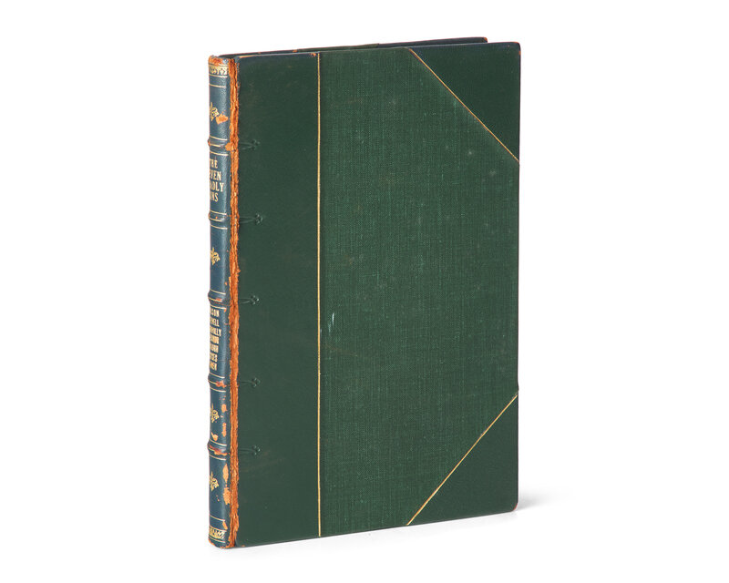 New York: William Morrow and Company, (1962). First edition, first issue, first printing. Presentation copy, humorously inscribed by Fleming on front blank to Margaret Hughes, mother of Larry Hughes, President of the publishing company William Morrow (and son-in-law of Hugo Pitman, Fleming's lifelong friend): "To Mrs John Hughes Whose son Larry Is certainly innocent of all of them! from Ian Fleming". 8vo. xvi, 87 pp. Three-quarter green morocco over green cloth-covered boards, stamped in blind and in gilt, joints and spine ends rubbed, small circular orange sticker at bottom of rear panel (applied by Larry Hughes, denoting importance); top edge gilt, other edges trimmed; marbled endpapers; signed by Larry Hughes beneath Fleming's inscription. Gilbert B3 (1.1)