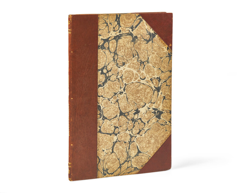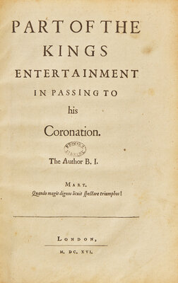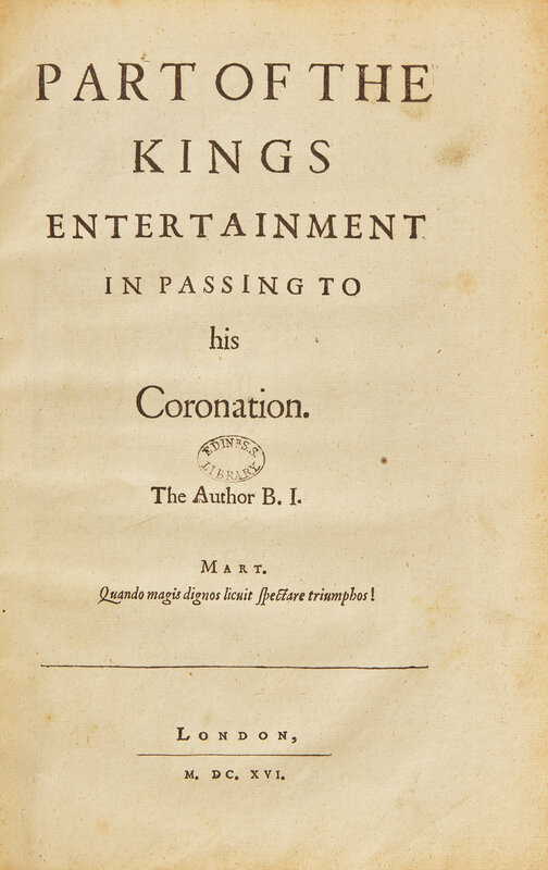 London: (Printed by William Stansby), 1616. Extracted from the first collected folio edition. Comprising pp. (841)-890: Part of the Kings Entertainment in Passing to his Coronation (pp. 841-862); A Panegyre, on the Happie Entrance of James, Our Soveraigne... (pp. 863-868); A Particular Entertainment of the Queene and Prince Their Highnesse at Althrope... (pp. 869-890). Three-quarter brown calf over marbled paper-covered boards, stamped in gilt; edges stained red; old circular library ink stamp on each title-page; scattered light spotting; faint dampstaining in top and bottom corners of most leaves. Pforzheimer 559