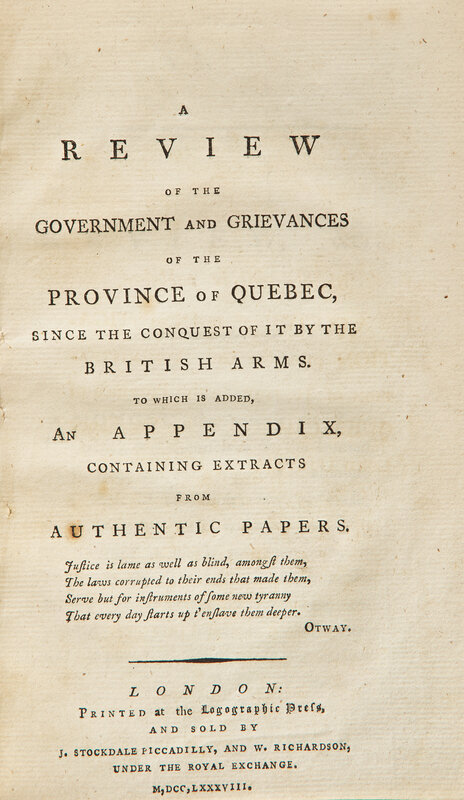 Scarce first edition of this polemic against the government of the Province of Quebec, published in the lead up to the passage of the Constitutional Act of 1791. Variously attributed to Adam Lymburner (1745/46-1836), a Scottish merchant, colonial agent, and politician, as well as English lawyer and attorney general of Quebec, Francis Maseres (1731-1824), both of whom lobbied for constitutional reforms in the colony.