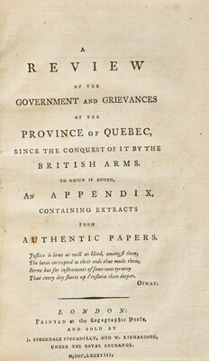Great Britain’s acquisition of New France following their victory in the Seven Years’ War brought together a unique mix of an English Protestant settler minority and an entrenched French-speaking Catholic majority. The Proclamation of 1763, and later the Quebec Act of 1774, attempted to put in place a government to manage this mixed population, implementing elements of both English and French law, while granting substantial rights and privileges to the French Catholics. Following the American Revolution and the large influx of American Loyalists seeking safe haven in Canada, the colony’s governing structure proved increasingly unsustainable for its new demographics, leading to calls for constitutional reforms, especially amongst the Anglo-merchant class. Here, the author calls for the repeal of the Quebec Act and for a redress of grievances faced by the Province’s population: "From a review of the government of the Province of Quebec, from the conquest of it by the British arms, it will appear that the people have had a complicated series of solid ills to encounter. The incompetent civil government, under which they have been obliged to live, and the vexatious uncertainty by which they have constantly been oppressed, with regard to their rights, and their property, furnish ample ground of substantial complaint. In the space of twenty-eight years they have been obliged to conform to three different systems of laws, each improper, and at variance with the other--Systems forced upon them in the aggregate, never defined, and of course never understood." (pp. 34-35)
