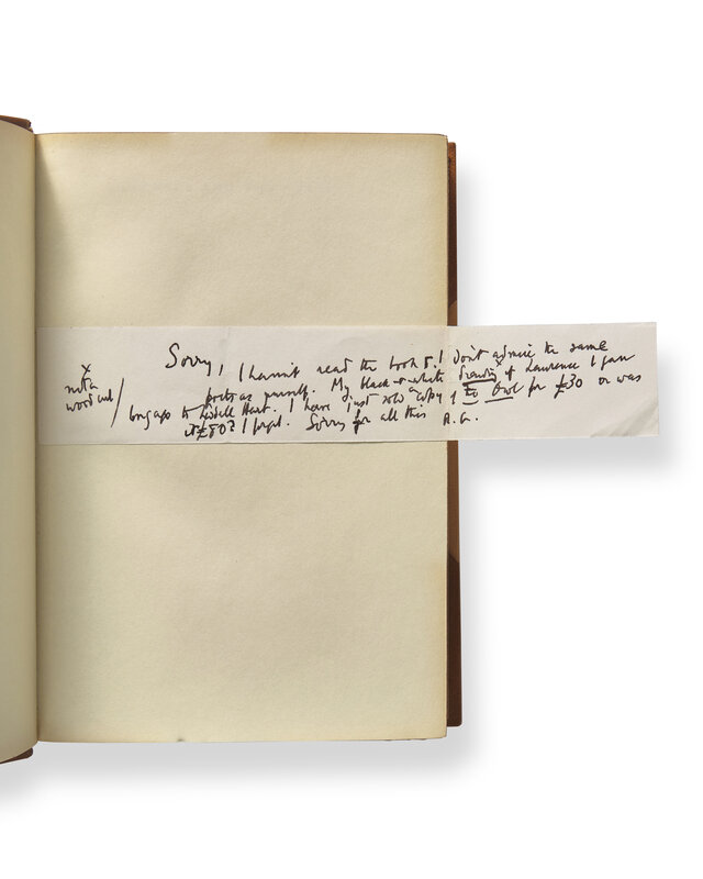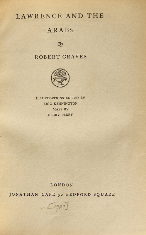London: Jonathan Cape, (1927). First edition. 8vo. With an autograph note, initialed by Graves tipped-in on front free endpaper ("Sorry, I haven't read the books. I don't admire the same books as yourself. My black & white drawing of Lawrence I gave long ago to Liddel (sic) Hart..."). With black and white reproductions. Three-quarter tan morocco over light tan linen-covered boards, decorated in gilt; top edge gilt; marbled endpapers; for Henry Sotheran Ltd.