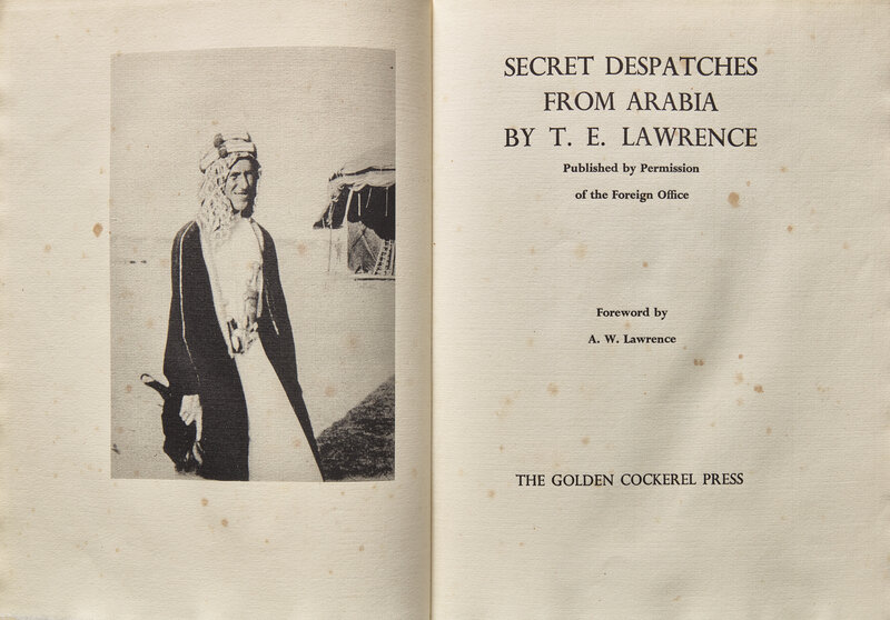 Cairo: Government Press and Survey of Egypt, 1919. First edition. 4to. Edited by Harry Pirie-Gordon, and containing two unsigned reports written by Lawrence. Illustrated with color maps. Original quarter brown cloth over printed wrappers; scattered wear.