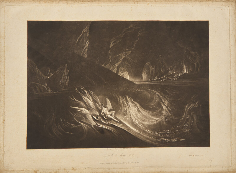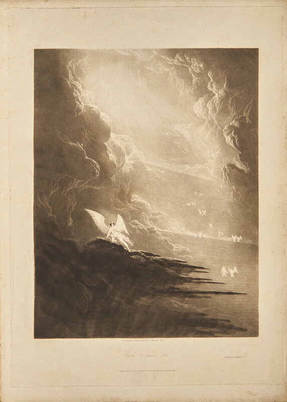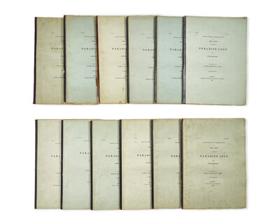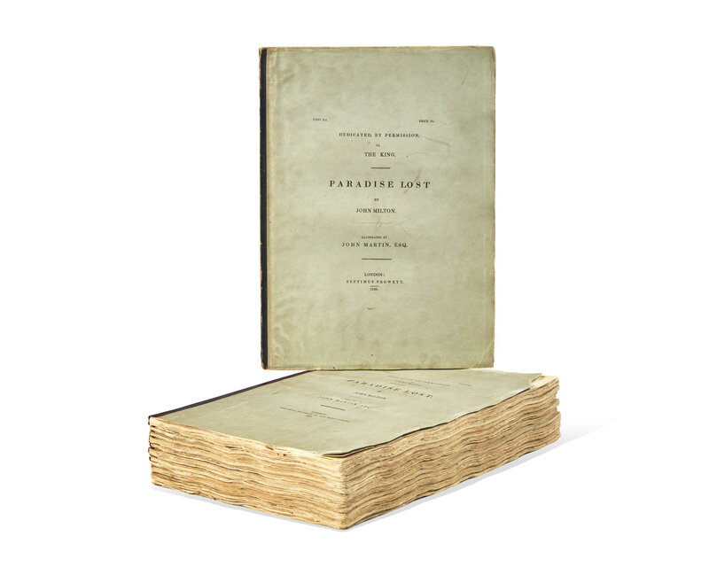 Rare and complete in original 12 parts, with all 24 of John Martin's magnificent mezzotints, considered "one of the great publishing enterprises of the age" (Ray). Published between 1825-27, each of the twelve parts appeared every few months, each containing one twelfth of the text and two plates. Martin's illustrations were the first of Milton's work to appear in mezzotint, and were unique compared to his predecessors, whereas they "minimized the context and filled the image with large, dramatic figures, Martin exaggerated the setting by creating great vistas and vast stretches of architecture..." (Wees & Campbell). The dramatic painterly quality and rich tonality of Martin's prints greatly elevated the medium of mezzotint, and were met with critical acclaim upon their publication, with one contemporary reviewer writing, "we know of no artist, whose genius so perfectly fitted him to be the illustrator of the mighty Milton...there is a wildness, a grandeur, and a mystery about his designs which are indescribably fine...the wonders of that Heaven and Hell which existed before earth was made, are magnificently embodied..." (Wees & Campbell).